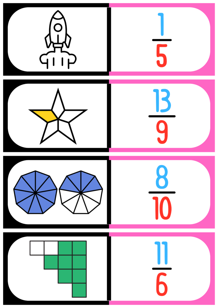 - soit associer l’écriture en chiffres d’une fraction à une représentation imagée de cette dernière (représentations circulaires dans la version A/représentations plus variées dans la version B),